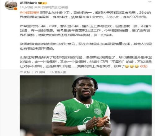 1月6日,媒体人苗原微博谈及泰山外援时称,“外援中卫目前多选一,略倾向于苏超球星布希里,26岁的民主刚果轮换国脚,身高体壮,疫情至今有1次大伤3次小伤,身价90万欧元。布希里对抗不错,出球、意识也不错,擅长压上参与进攻,但他速度一般,不擅长回追,有一定的隐患。”
