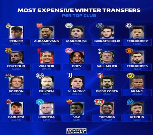 德转列五大联赛20大俱乐部冬窗最贵引援:巴萨1.35亿签库鸟第1 -